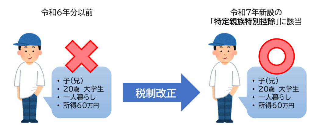佐藤家の子(兄)は、まさに 「特定親族特別控除」 の対象となり、 「特定扶養親族控除」と同額の63万円控除を受けることができるようになります。