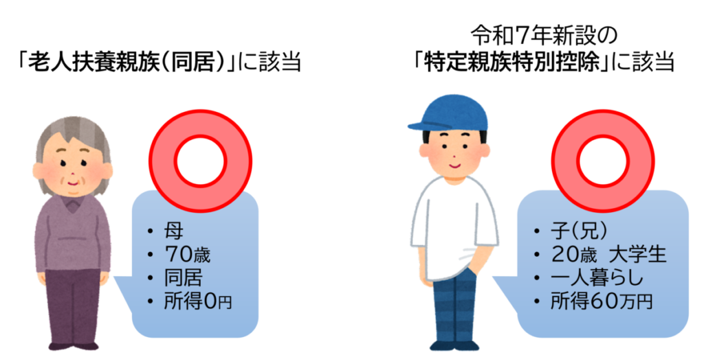 上記の通り、消去法で判定したところ佐藤家で扶養控除の要件を満たすのは、「母」と「子(兄)※令和7年分以降」 でした。