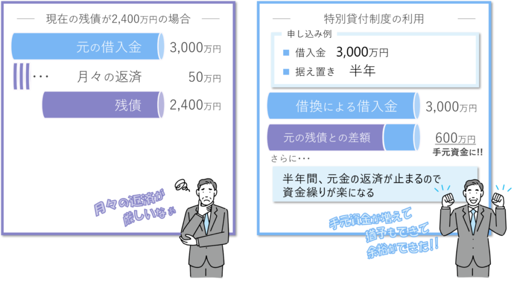- 半年間元金の返済が止まるので、資金繰りが楽になる