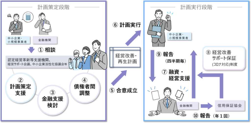 専門家(中小企業活性化協議会、認定支援機関など)の支援により作成した計画に基づき、事業存続に必要な資金を保証する融資制度となっています。