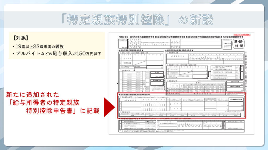 - 12月31日時点で19歳以上23歳未満の扶養親族が対象(大学生などの子どもが想定)。