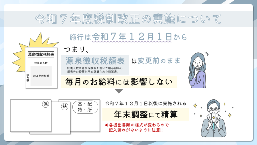 これらの改正は「令和7年度」と言われていますが、実際に施行される日は令和7年(2025年)12月1日となっています。そのため、給与収入で源泉徴収されている方にとって働き方が同じであれば、手取り額がこれまでと変わることはありません。月々のお給料への反映はされませんが、改正が適用されるのは令和7年分であり、令和7年12月1日を超えて実施される年末調整の際にまとめて精算されます。